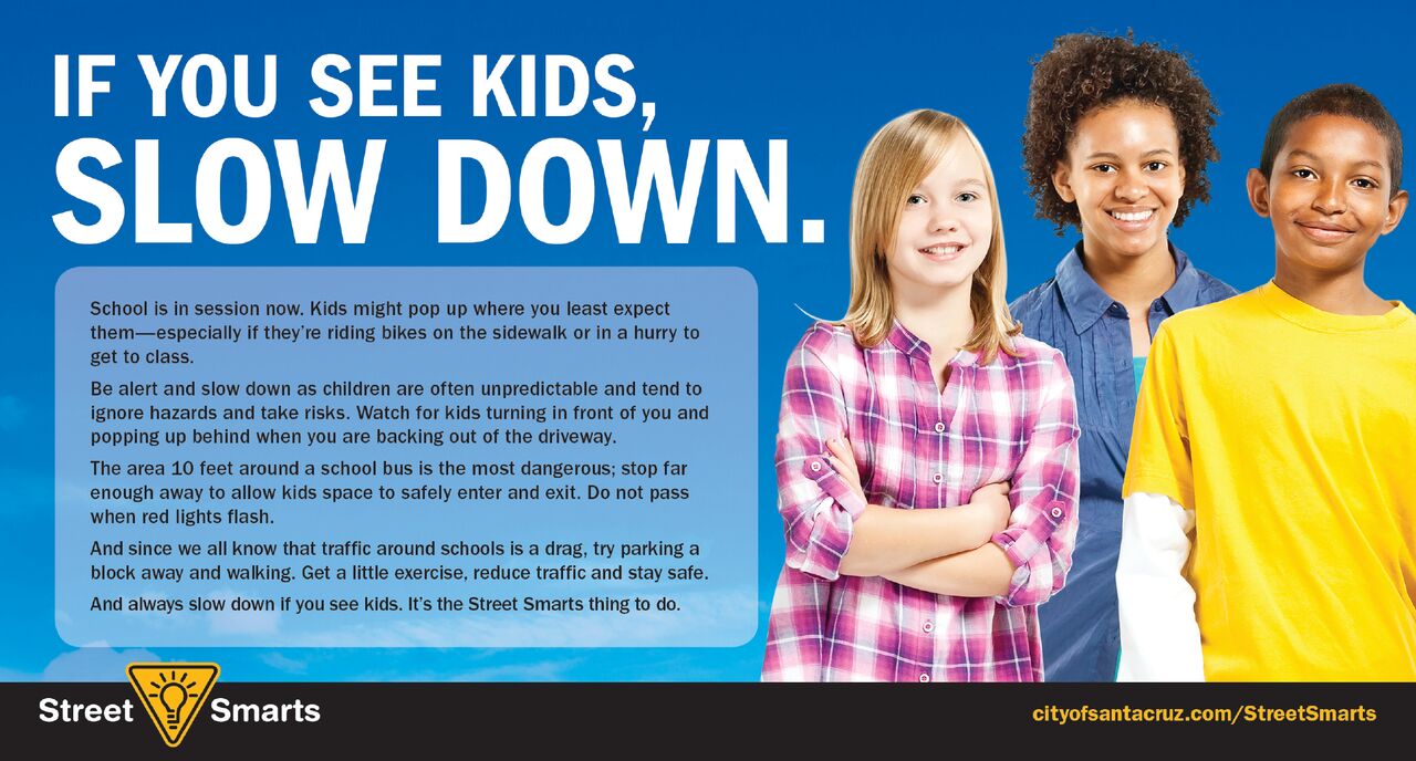 Street Smarts officially kicks off with a family-friendly celebration on Wednesday, Sept. 13, at Kaiser Permanente Arena, 3-6 p.m. Santa Cruz Warriors mascot Mav’Riks, UC Santa Cruz’s Sammy the Slug and California Highway Patrol’s Chipmunk Chipper will lead young and old in activities that underscore safe rules of the road. There will be 15 booths with interactive games, free valet bike parking, bike safety rodeo and one free raffle ticket per person for prizes including Southwest round-trip air tickets, free car service, new bikes, walking shoes, reflective gear, and more.
