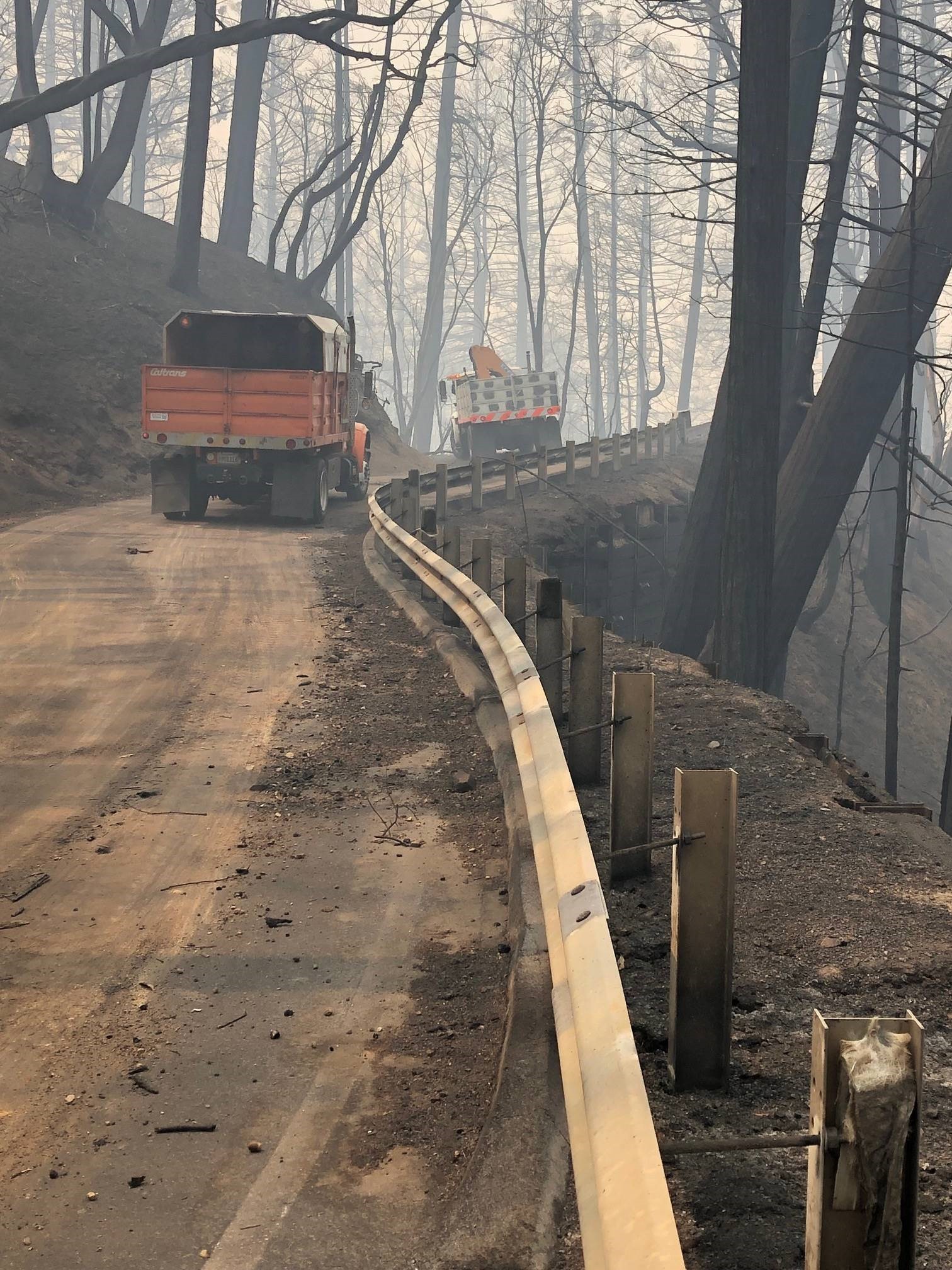 Caltrans has mobilized contractors and sub-contractors to respond to this damage which includes hundreds of fallen and hazardous trees, a dozen locations of burned guardrail, numerous destroyed traffic signs and markers and damage to the lagging/facing of a retaining wall.
