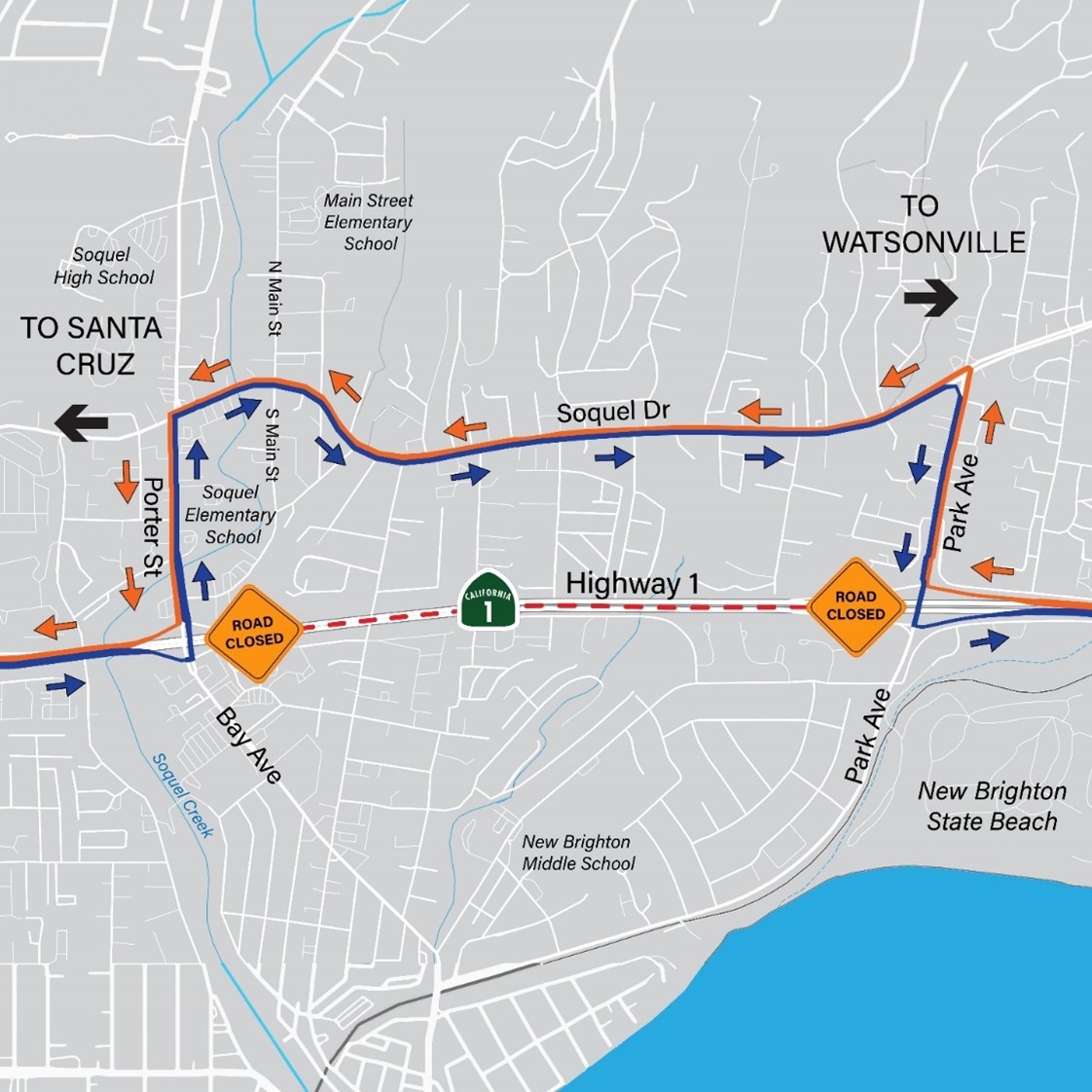 Southbound Highway 1 Detour: Motorists traveling southbound on Highway 1 will be directed off at the Bay/Porter exit, will travel south on Soquel Dr., and return to southbound Highway 1 at the Park Ave. onramp.