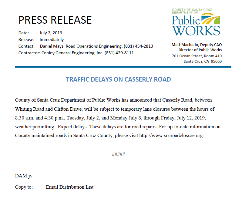 County of Santa Cruz Department of Public Works has announced that Casserly Road, between Whiting Road and Clifton Drive, will be subject to temporary lane closures between the hours of 8:30 a.m. and 4:30 p.m., Tuesday, July 2, and Monday July 8, through Friday, July 12, 2019, weather permitting.